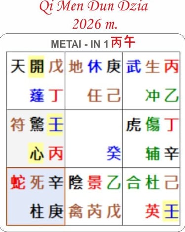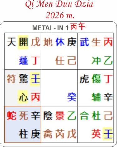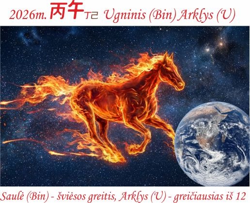 UGNINIS ARKLYS 丙午丁己 – tai 9 -tojo periodo pikas, Intensyvių dviejų skirtingų polių ugnių konkurencijos metai. Saulė, jan ugnis(丙) sėdi ant savo „turto grobiko“ (丁) ir „valdžios iššūkio“ (己). „Turto grobikas ir valdžios iššūkis“ - „agresyvios dievybės". Jos laužo nusistovėjusią tvarką, meta iššūkį autoritetams, atsisako paklusti senoms stagnuojančioms taisyklėms.